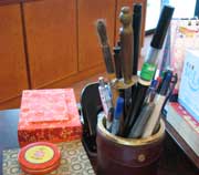金庸的印鑑盒、筆筒和筆。金庸一直都是用筆寫稿,少用電腦,可見助其盡顯行雲流水之功的筆,有多重要了。 |