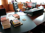 金庸的辦公桌,不減文人氣息。側圓桌上擺著《古本小說集成》、《秦氏千年史》、《中國學者看世界》等書。 |