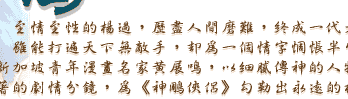 1998年底,在各方引頸而盼下,《神鵰俠侶》(漫畫版)1-18集終於全部出齊了,這部漫畫繪製期雖僅歷時兩年,但構思期卻長達十年之久。打兒時起,黃展鳴就是個金庸迷,視金庸為超級偶像,每每將金庸作品讀得滾瓜爛熟,並對金庸筆下的武俠世界和故事結構再三咀嚼。這次畫《神鵰俠侶》,是為自己熟悉的楊過與小龍女設計形像,亦可說是帶著和老朋友重逢的感情繪製。不少評論家稱讚這部漫畫著作:「結合了日本與港式畫風,演化出極為討喜的調性…」我們確實從千百格畫窗牽引中,察覺到作者筆下流露出一種文字以外的美感和動感,同時也欣賞到作者細膩的筆觸、純熟的技巧、以及浪漫、瀟灑的畫風! |