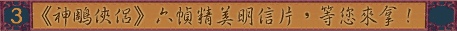 話說兩年前香港版、台灣版的《神鵰俠侶》甫發行,港台出版界、漫畫界及廣大金庸迷立即拍手叫好,原作者金庸對於黃展鳴所塑造的楊過與小龍女,更是愛不釋手,金庸形容楊過與小龍女的造型“英秀俊美、令人傾倒”,對於畫中所畫的全真教教址也讚不絕口,後來欣喜之餘,還寫了兩幅字給黃展鳴,一幅以黃展鳴的名字做對聯,即「展奇才於畫壇,鳴藝聲於獅城」,另一幅則勉勵他:「如楊過之瀟灑,學楊過之勤奮」,並且決定由出版社印製楊過和小龍女明信片,廣為流傳。 |