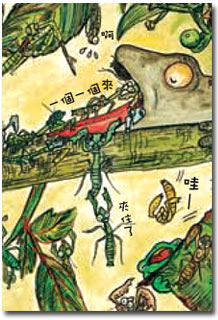 仔細找找看,在每一幅跨頁的圖畫中,都藏有好多隻不同姿勢、不同動作、正在歷險中的螳螂,充滿了尋找和發現的樂趣。作者還活用連環式的多格漫畫,表現出螳螂寶寶被一隻鳥兒襲擊時的驚險場面,以及螳螂寶寶玩得開心,但不小心飛進蜘蛛網,慘叫一聲「啊!」的可憐相。同時也畫出螳螂寶寶吃了蝴蝶後的得意表情,卻不知大禍臨頭,一路跑進蜥蜴大嘴裡的意外事件! |