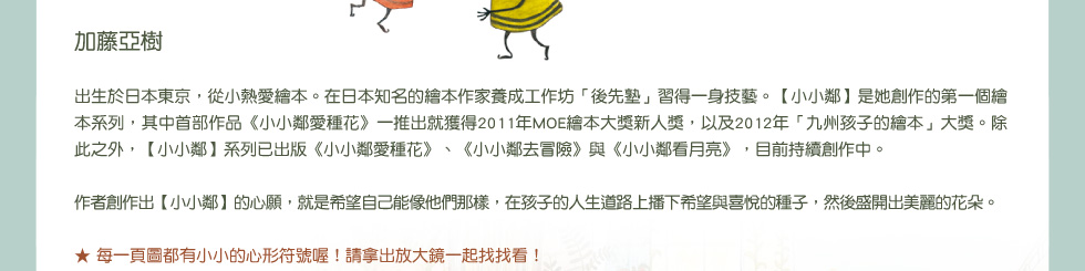【小小鄰】是個有點像人類、又有點像蟲子的小小生物,他們的生活形態與街頭旅程是天真而趣味的。加藤亞樹以親切輕盈的方式,創作出雙手勞動與自然和諧的共生之美,我相信這套【小小鄰】必然會是孩子書櫃裡的最愛。