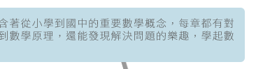 我想這套書對學生而言,無論是小學生或國中生甚至高中生,都是隨時可回頭再翻閱並重新理解數學的書,它能改變你對數學的感覺,在充滿挑戰和樂趣中學習數學,讓學習數學的歷程是一種快樂!