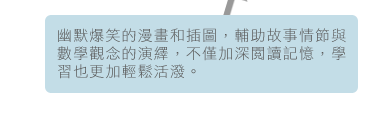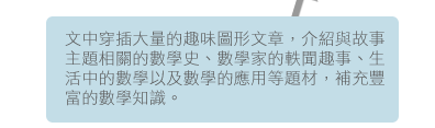 本書的另一大特色是每章皆有對應的數學概念,文中穿插了許多小方塊文,引入大量與主題相關的數學史、生活中的數學以及數學的應用等題材。孩子可從數學的發展中了解數學的起源與演變,體認一門學問的建立往往需要經過漫長歲月的累積,並珍惜感恩這得之不易的智慧結晶;從數學家的故事及軼聞趣事中知悉前人探求真理、建構知識的過程和方法,感受數學的人性面與人情味;並在數學的應用中,了解我們的生活及社會發展是如何與數學緊密相關,從中產生興趣,進而樂於學習。