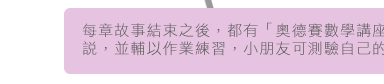 此外,每章最後還開闢了「數學講座」,針對數學概念做較全面性的介紹,並輔以作業練習,小朋友可藉此測試自己了解了多少。