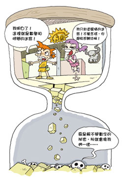 奧德賽掏出沙漏,倒過來開始計算時間,一邊對伊芙娜說:「我也不知道。3、5、7 這三個數字是線索,要計算一下才行。我們先離開這裡。」