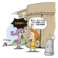松鼠蹦到入口處矗立著米諾斯王銅像的手上,往下用力跳一下,城牆上的巨石發出「轟隆」巨響,同時向兩旁移開。巨石後連接著一條通道,通道裡也傳來岩石打開的聲音。