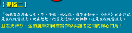 保羅突然怒由心生,不,安妮,他心想,我不是妓女。《快車》的創作就是在拒絕當妓女。現在想想,把苦兒這個人物幹掉,也是在拒絕當妓女。我開著車要去西岸慶祝自己從良,而你卻在我撞車後,硬把我從車子裡拖出來推回火坑。幹一次兩塊,四塊錢老子就包下你了。看你的眼神,我就知道你心底其實也明白。陪審團可能會因為你是瘋子而放你一馬,但我不會,安妮,老子可不會。