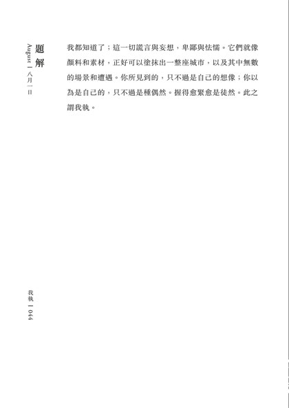《我執》寫的,正是一種極度強烈的「有我」的文學;《我執》記錄的,正是唯有透過這種「有我之境」才會出現的奇異景致。雖然一開頭八月一日的〈題解〉文中說:「你以為是自己的,只不過是種偶然。握得愈緊愈是徒然。此之謂我執。」然而放在閱讀與文學的範圍中,「徒然」非但不是「徒然」,反而要從「徒然」中、從對於「徒然」的虛無慨嘆中,才有辦法燦然冒生出值得被領略記取的光彩來。