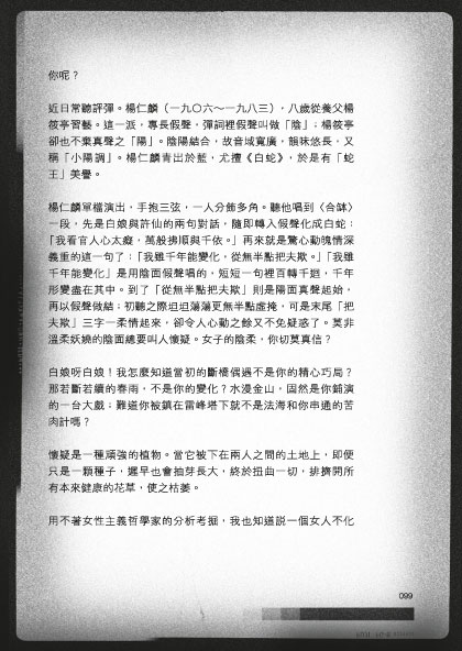 不,如此看待這批文章,太直接太簡單,缺少了認真閱讀文學作品所需要的複雜「可疑可議」態度。梁文道和那個挫折著痛苦著思念著的敘述者之間,不能如此直接簡單等同起來,而該有著其他「可疑可議」的關係。