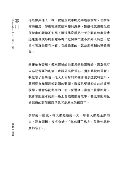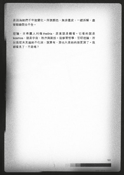 在二○○六年八月到十二月間,他讀了《戀人絮語》、《貓河》、康拉德的傳記、《魂斷威尼斯》、《禁錮在德黑蘭的羅麗塔》、Edward Hopper的畫、《空間詩學》、《紙房子》、《生活與命運》、《書簡三疊》……等等、等等。他的生活、他的經驗,由這些閱讀堆砌構築而成。