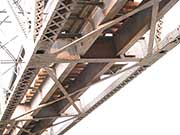 | 所謂的「弦材」、「斜材」、「柱」等構件,好比組成桁架的一根根「單樑」。桁架的外觀看起來完美而對稱,但事實上每個部位承受的力道卻不相同。由於鋼鐵是非常昂貴的材料,因此只要能應付承重,每個構件都會盡量「省料」。於是,我們便可以從外觀的粗細不同,看出各部位受力的大小。很明顯地,「弦材」最粗,「斜材」次之,「柱」最細。越粗的受力越大,越細的受力越小。觀察桁架細部的同時,我們彷彿可以看到重力流動的的大小和路徑。於是乎,「桁架」便成為最能展現「力學美感」的一種橋樑結構了! |