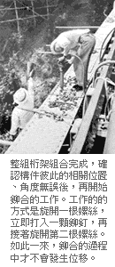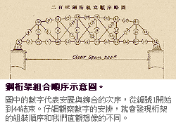 桁架的組合工作是在湍急的溪水之上進行。首先必須架設鷹架,然後請來起重機,將一根根單樑吊起來,用鉚釘依次鎖緊。不要忘了:每根單樑都是很重的!當一根「斜材」懸在半空中,只有一端鉚緊,另一端尚未和相鄰構件結合以前,強大的重力會迫使它「下垂」或「移位」。對於這樣一個龐然大物,移位幾公釐是肉眼無法辨別的,但後果卻會導致組桁失敗!還有,每個構件組合的順序,也是令工程師戰戰兢兢,反覆推敲難得其解的。如果我們能在河床上整理出一個完美的「平地」,然後在地上組合桁架,就可以避開在溪水上懸空工作的困難,以及結合過程中自身重力的拉扯。但問題是組合好的桁架太重,根本沒有起重機能吊起它。就算能吊起,也無法開到河中央安置。一個完美對稱的桁架成品背後,其實隱藏著一堆令人想都想不到的技術困難的呢! |