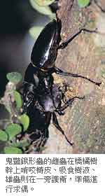 台灣低海拔郊山的不少柑橘園,可說是找尋鬼豔鍬形蟲的最佳去處,不過找到這種迷人的鍬形蟲後,千萬別急著捕捉牠們,建議你靜靜在一旁守候觀察,很可能有機會目睹到雄蟲對正在覓食的雌蟲展開溫文儒雅又極富耐心的求偶過程;或是發現兩隻雄蟲為了爭食樹液,而發生短兵相搏,但點到為止的君子之爭。