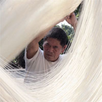 已經可以獨當一面的師傅兒子仔細地向我們解說手工麵線的製作過程。將細白的麵粉和著食鹽、水揉捏成麵團,套上木棍繞成圈,接著以機器搓揉成細條狀,沾上米糠防止麵線互相黏合,再將麵線用人力拉三至四次,每次對摺,從中點套上木棒再拉開,麵線會變得更長,也才會是適當的粗細。整個過程中,最重要的是拉的力道與速度,太大力,麵線會斷掉,太慢,麵線會掉到地上。麵線好吃與否,跟做的人有著絕對的關係。