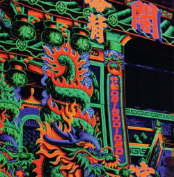「這就是人家說的黑人光!」陳明山師傅拉下廠房的鐵捲門,讓我們親身感受看野台戲的男男女女眼中的奇幻布景,原本就已色彩鮮豔的彩繪背景,在藍光底下更顯得鮮活,螢光塗料繪成的樓閣在黑暗中光芒四射,宛如七彩的寶石,想像布袋戲偶在澈亮的階台上大動干戈有多威風!再回頭看看同伴們的臉,該是白色的衣領、牙齒都被鑲上了藍邊,反射不到藍光的髮膚則全部隱沒在黑暗之中。原來這就是夜晚的野台戲迷人的地方啊!平時熟悉的人、事、物沒入黑夜後,取而代之的是布袋戲、歌仔戲飛舞的身影,和其後布景彩繪師傅筆下了無邊際的世界。