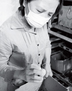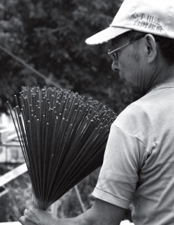 斗室裡,香粉的塵埃將日光燈及窗邊屋頂流露進來的少許照明,鋪上一層昏暗的紗幕,搖晃的竹篩旁,展開的香腳下,塵埃隨著師傅的動作飛舞到室內各個角落,一待落定,就在桌上、架上、窗台上堆積厚厚一層灰。工作時,師傅習慣在窗邊點一炷香,上升的煙霧裊裊地爬上窗櫺便散了。