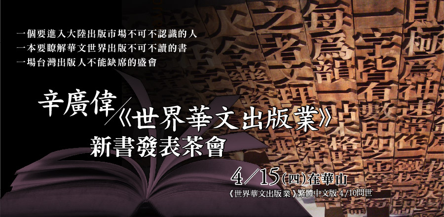 曾以《台灣出版史》令台灣出版人側目、汗顏的辛廣偉先生,在2005年出版了英文版的Publishing in China。這是第一本完整勾勒華文出版現狀的英文著作,範圍含括中國大陸、香港、澳門、台灣等地。