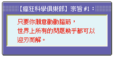 東方 (從日本、中國大陸、台灣到南洋諸國) 的民族,在家長式權威的長久教育方式下,逐漸泯沒了青少年創造能力的嫩芽,斲喪了他們築夢的心,這是很可惜的事。【瘋狂科學俱樂部】系列,以極高的趣味性和可讀性,不僅是補充青少年科學教育的絕佳好書,更可提供為人父母和教師閱讀,並從中獲取若干和青少年互動、教育的啟示和發想。