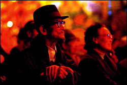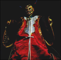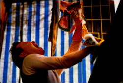 | 演師是布偶的靈魂,他隨著布偶的演出,時喜時怒,渾然忘我。這是小西園許王的演出情形,他也是李天祿的學生之一。 |