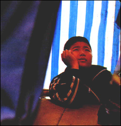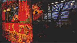 | 彩樓背後的戲棚是孩童攀爬窺探的神秘世界。 |