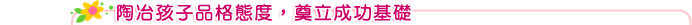 品格必須透過身教、陶冶、參與活動、閱讀和討論中學習得來。從小養成紀律和規範的孩子,不論心理健康、人際互動、學習效果、生活目標,都會有積極正向的表現。 |
