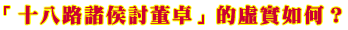 《三國演義》第5回寫到:曹操逃離洛陽,到達陳留以後,立即發矯詔給各地,號召各路英雄共同討伐篡奪朝廷大權、胡作非為的董卓。很快便有十八路諸侯分別起兵,會集到洛陽附近,「各自安營下寨,連接二百餘里」真是聲勢浩大,威風凜凜。儘管這次討伐虎頭蛇尾,最後竟草草收場﹔但它卻是《三國演義》中的一次重大戰役,是書中一批重要人物的一次集中「亮相」,其中的「溫酒斬華雄」、「三英戰呂布」等精彩情節,給讀者留下了十分深刻的印象。