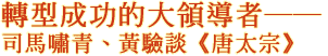司馬:從這些不成熟的一面可以得到印證:一個領導人並不是與生俱來,必須經過學習、調整,也就是企業常講的「轉型」,李世民是經過「謀取天下」、「治理天下」兩大階段的磨練與成長,才成為「貞觀聖帝」的。