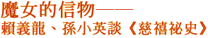 賴義龍(以下簡稱「賴」):《慈禧祕史》是一部非常精彩、獨特、帶有推理色彩與異國情調的歷史小說,以清宮為舞台、慈禧為核心、以乾隆帝的「龍玉」來串場,以戊戌變法的風暴為壓軸,架構而成的一部長篇歷史小說。