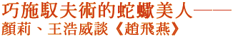 顏莉(前實學社編輯以下簡稱顏):趙飛燕從寄人籬下的歌女,到飛上枝頭當鳳凰,得成帝專寵,生命處境由逆轉順。照理說,趙飛燕應該很滿足了,但人的處境不同,要求的東西似乎也不一樣,趙飛燕凡事先憂三分的性格,使她表現出一種無止盡的貪婪,似乎必須不斷地攫取再攫取,才能滿足她底蘊的不安全感。