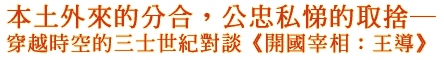 王導的一生功過,後世評價不一。王陽明曾經借夢發揮,指出:「世之人徒知王敦之逆,而不知王導時陰主之」;而王夫之讀了司馬光《資治通鑑》後,眉批「王導之能秉政也,始建江東者也」。兩位學者的看法南轅北轍,形成有趣的對照。為此本社透過虛擬網路,讓他們超越歷史時空齊聚一堂,來一場世紀大對談,為讀者揭開這一頁歷史的迷霧。