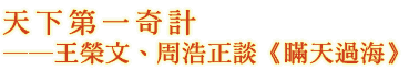 周浩正(《小說三十六計總策劃》,以下簡稱周):《瞞天過海》是〔小說36計〕系列的第一本,它的副書名為〔竊鼎記〕,顧名思義就是在神不知、鬼不覺中取得了國家權柄,構想本身創意十足,真是個千古奇計!