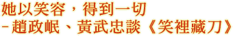 黃武忠(作家,國立文化資產保存研究中心主任秘書,以下簡稱「黃」)):「笑裡藏刀」也就是口蜜腹劍的意思。表面上永遠笑臉迎人,骨子裡時時磨刀霍霍,俗稱「笑面虎」就是這種人。但是,我們今天談到的「笑裡藏刀」,有些悖離了這項定義,主角之一—莊太后,是以她的善良秉性,來執行這一計略,偏偏做的天衣無縫,讓我好好上了一堂了解人性的課。