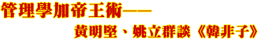 姚:韓非的管理方法中談到君王要會用「術」。他說韓昭侯、衛嗣君都曾運用手段以御臣下──私下先將事情打聽清楚,然後將之公開,讓臣下以為君王明察秋毫,從此畏服,這便是君王用術以駕馭臣下的最佳例子。從現代政治或企業管理的角度來看,這樣的領導統御術,是否會流於權謀?