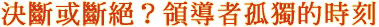 有疑惑才需要決斷。當情勢明朗,一片大好時,順勢而為,不需費神決斷。而在不確定、不安全時,智囊團再多的分析報告,再多的建議進言,都無法取代領導者的一句話。這時的領導者必須選擇,必須取捨,必須決定,只有他可以做決策,他是孤獨的。