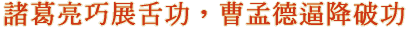 一開始,諸葛亮除了凸顯曹操的赫赫功業,並把劉備從荊州倉皇逃亡、投靠孫權的經過重新演述,看起來只是你知我知的廢話,實則另有用意。諸葛亮巧妙的暗示,劉備敗逃,不是劉備不行,而是曹操太強了,你看袁術、呂布、袁紹等一方之霸,不都成為曹操爭霸的祭品?這一點認知,在接下來的辯論中發揮不小的功用。