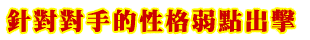這兩則主題談的是如何針對對手的性格弱點出擊。競爭型態有很多種,如果主其事者主導戰局,其個人的性格、觀點、學經歷背景成為團隊行動的關鍵,競爭對手便可針對他的性格弱點,找出因應之道。
