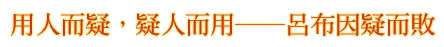 因為對部將有疑慮,呂布放棄陳宮所提的突圍奇計,後人每每歸咎於紅顏禍水,說呂布不該聽信女人的話,這是大男人主義之下的「沙豬」觀點。若呂布對部屬全然信賴,若呂布陣營諸將彼此信任,呂夫人再好的口才,再楚楚可憐的形象,也難以撼動呂布的決策。追根究底,還不是一個「疑」字。