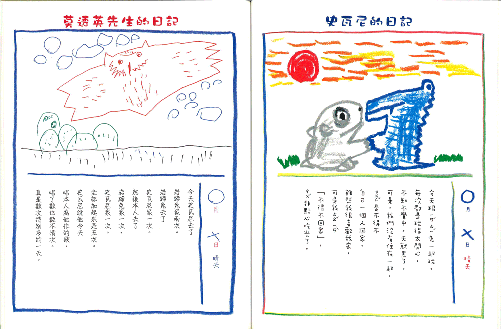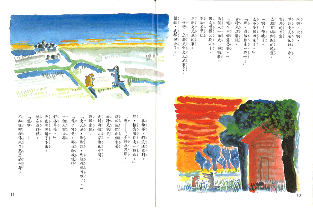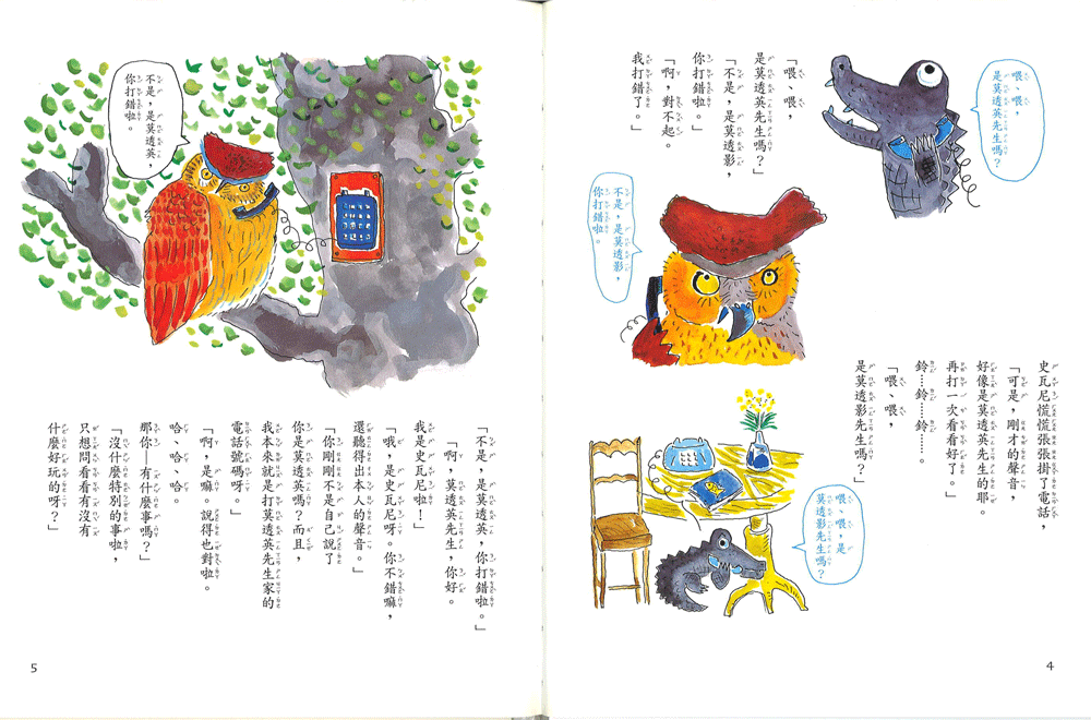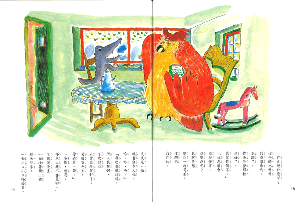 「這本書真有趣,明明是小小的貓頭鷹卻畫的大大了,而強大凶猛的鱷魚卻畫的和善可愛,感覺上一切都相反了。不過,莫透英和史瓦尼的感情真好,一直都沒變。」