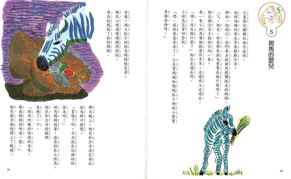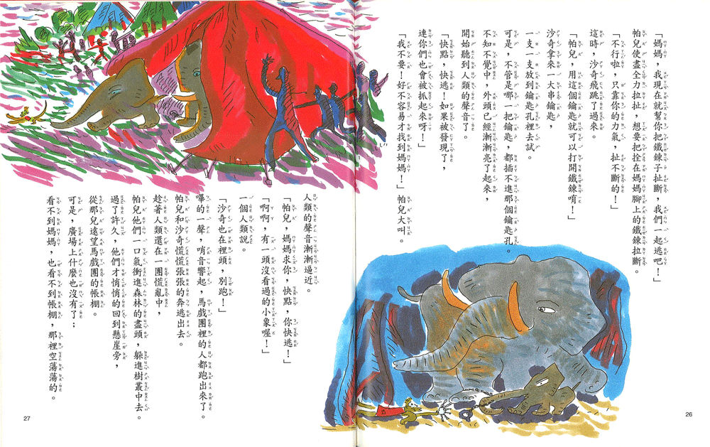 【小鱷魚史瓦尼】+【小象帕兒】,以學習識字以後的小學生為主要對象,一方面持續孩子對於繪本的閱讀興趣,同時增進孩子們的文學素養;既不中斷他們在閱「圖」上的樂趣,又能滿足他們進入「文字」世界的渴望。「故事繪本」的特色是除了具備一般繪本以圖像傳達故事的基本要素之外,在文字的呈現上還需具章節的雛形、增加起承轉合的鋪陳、及更多細節的描述等特點,是有助於孩子在「文字」閱讀能力的提升。