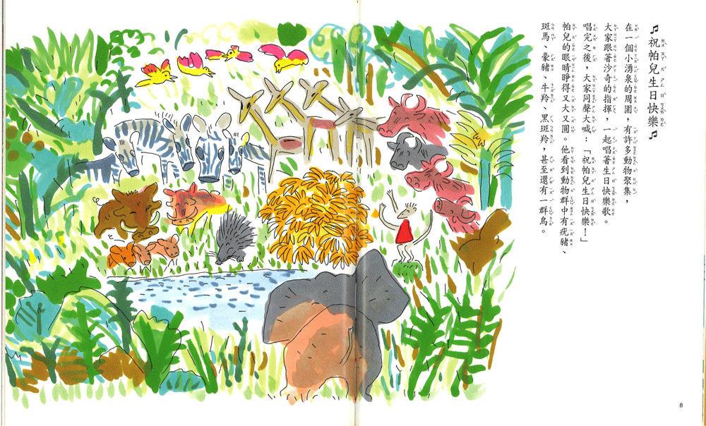 「小象帕兒這套書除了包含了帕兒和同伴間快樂嬉戲、互助合作的溫馨情節外同時也突顯人類與動物間的高牆。每本書還會在一開始先介紹故事中動物的習性,看故事也吸收知識,一舉兩得。」